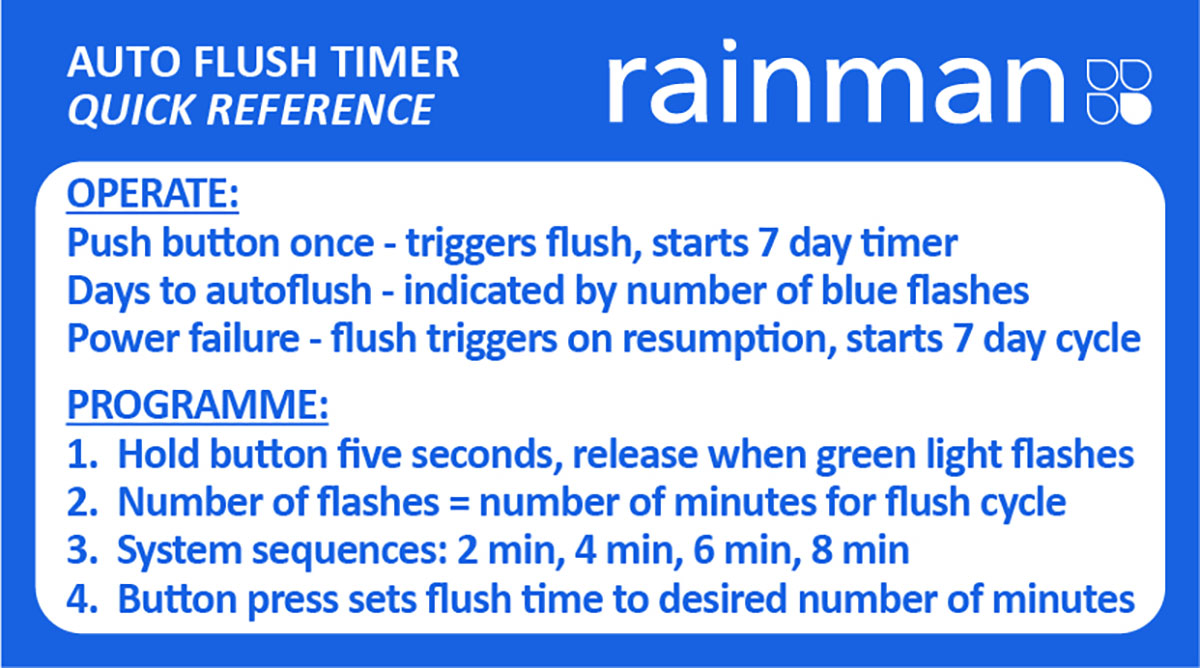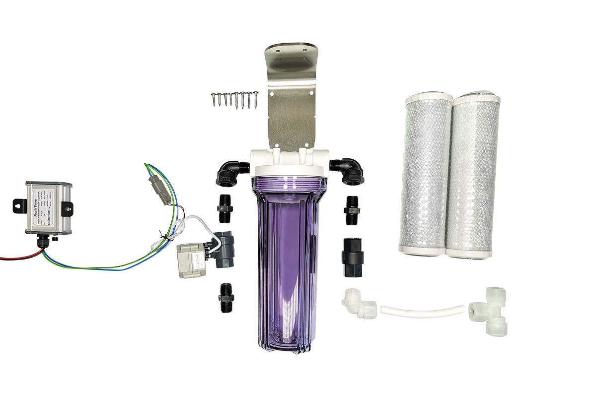 Autoflush System vključuje časovnik, elektromagnetni ventil in filter z aktivnim ogljikom, ki omogoča, da bo sistem pitne vode na vašem plovilu vsakih sedem dni za nekaj minut splaknil desaliniztor s sladko vodo iz rezervoarjev. Časovnik z enim kalibracijskim gumbom lahko nastavite med dvema in osmimi minutami splakovanja, odvisno od tega, kako močna je črpalka. Filter z aktivnim ogljem nevtralizira klor, ki je morda v vašem rezervoarju.